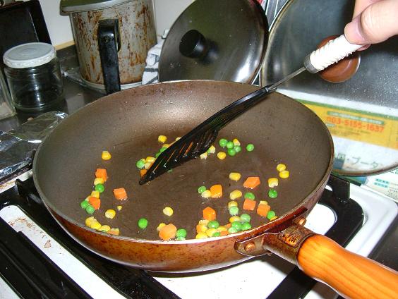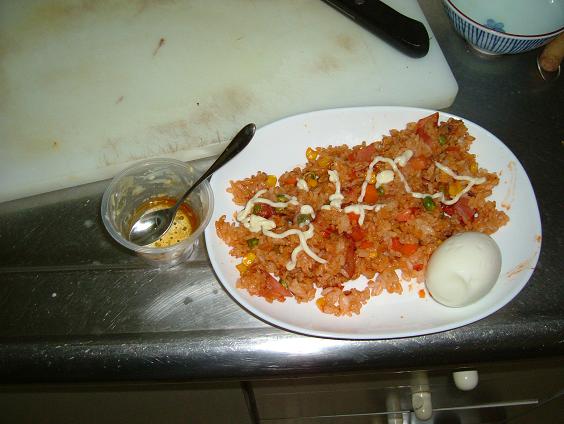 ……美少女を招待しました、ご覧あれ。 今日の昼食:オムライスもどき(たまごは上に乗せただけ) ・ベーコン ・ケチャップ ・タマゴ ・マヨネーズ ・グリーンピースなど 上の画像の材料に加えてご飯とソースも用意しました。 え?明らかにいらないものが混じってるって? カスタードプリンは作ってる合間合間に食べるんですよ。 常識です。 グリーンピースは凍っているのでレンジで一分ほど暖めました。 それでフライパンに入れればすぐ火が通りますからね。 それでケチャップとソースをまあ、7:3くらいで入れました。 やつらは顔目掛けて襲い掛かってきますので注意してください。 それでベーコンとかと一緒に炒めて、適当にごはんを入れました。 全部に均等にいったと認識したらごはんを端によせ、タマゴをあるぇー!? ゆでタマゴじゃん、冷蔵庫にあるの……。 なんか妥協して完成しました。 本当はタマゴの生地を作って上に被せてマヨネーズで「妹」と入れようとしたんですよ。 でもごはんの上はでこぼこで面倒くさかったのでしませんでした。 ああ、カスタードプリンは美味しかったなあ。